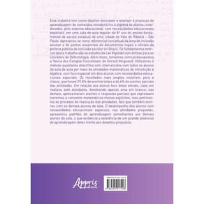 Este trabalho tem como objetivo descrever e analisar o processo de aprendizagem de conteúdos introdutórios à álgebra de alunos considerados, pelo sistema educacional, com necessidades educacionais especiais, em uma sala de aula regular de 8º ano do ensino fundamental de escola estadual de uma cidade do Vale do Ribeira – São Paulo. Apresenta-se como referencial conceitual da área de inclusão escolar e de pontos essenciais de documentos legais e oficiais da política pública de inclusão escolar no Brasil. Os fundamentos teóricos deste trabalho são os estudos de Lev Vigotski com ênfase para os conceitos de Defectologia. Além disso, tomamos como pressupostos a Teoria dos Campos Conceituais, de Gérard Vergnaud. Utilizamos o método qualitativo descritivo com intervenções com todos os alunos da sala de aula por meio de atividades matemáticas de introdução à álgebra, com foco especial em dois alunos com necessidades educacionais especiais. Os resultados mais amplos mostram, para a classe, que houve 29,8% de acertos totais e 46,6% de acertos parciais das atividades. Em relação aos alunos foco deste estudo, cada um realizou sete atividades, devolvendo apenas uma em branco; nas demais, apresentaram acertos e respostas parciais que expressam teoremas e conceitos matemáticos menos explícitos, mas pertinentes ao processo de resolução das atividades, fato que também ocorreu com os demais alunos da sala. O desempenho dos alunos com necessidades educacionais especiais, nas atividades propostas, apresentou padrões de aprendizagem semelhantes aos demais alunos da sala, o que evidencia a existência de um grande potencial de aprendizagem deles frente aos desafios propostos. Ean: 9786525017228