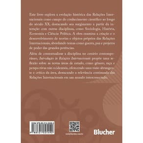 Este livro explora a evolução histórica das Relações Internacionais como campo do conhecimento científico ao longo do século XX, destacando seu surgimento a partir da interação com outras disciplinas, como Sociologia, História, a Economia e a Ciência Política. A obra examina a criação e o desenvolvimento de teorias e objetos próprios das Relações Internacionais, abordando temas como guerra, paz e projetos de poder das grandes potências. Além de contextualizar a disciplina no cenário contemporâneo, o livro propõe uma reflexão sobre as novas áreas de estudo: gênero, raça e perspectivas não ocidentais, oferecendo uma visão abrangente e crítica da área, e destacando a relevância continuada das Relações Internacionais em um mundo interconectado.