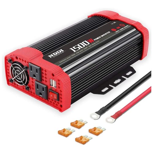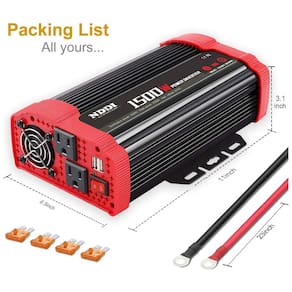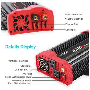 Característica NDDI o inversor de energia fornece uma tomada de corrente contínua de 2AC de 1500 watts pico de potência de 3000W, 2 portas Smart USB 3.1A, projetou um switch para melhorar a usabilidade e a conveniência. e conveniente o inversor de carro possui 4 fusíveis substituíveis, permitindo que você lide facilmente com o problema de substituir o fusível. 2 ventiladores silenciosos inteligentes embutidos minimizam o ruído, aumentam a vida útil e prolongam o tempo de uso. Amplamente utilizado o conversor de carro resolverá seus problemas de carregamento na estrada, executando o equipamento para viagens. Uma excelente opção para uma longa viagem de carro, camping, emergência e escritórios, etc. carregamento de dispositivos eletrônicos, como laptop, telefone celular, câmera digital, barbeador, secador de cabelo, etc. Tamanho do inversor Inversor automotivo L x W x H x 16, x 7,, peso 2,5kg. Este inversor possui várias proteções, evita sobrecarga, superaquecimento, curto circuito, baixa voltagem, alta voltagem. Lista de pacotes 1 inversor de energia de 1500W, cabo de conector O ring de 2 peças e , 1 manual do usuário, 4 fusíveis 40A. A NDDI é uma empresa de alta tecnologia para o desenvolvimento, fabricação e ização de conversores de automóveis avançados, sistema solar, carregador de energia de alta frequência e etc. a alta qualidade. Nosso objetivo é fornecer as melhores soluções profissionais de energia para você NOTA Evite operar o inversor enquanto a mão estiver molhada. Evite inserir a CA no inversor de energia. Evite usar produtos que excedam o valor máximo do produto. Evite usar o plugue do isqueiro ao usar o inversor em dispositivos acima de 1500W. Evite deixar o inversor de energia nos estados LIGADO enquanto seu carro estiver DESLIGADO. Evite a exposição prolongada à luz solar, resultando em temperatura excessiva ou escaldadura do produto. Especificações Terno para bateria de 12V. Saída 110V. Potência 1500W. Potência de pico 3000W. Forma de onda de saída onda senoidal modificada. Portas de carregamento USB 3.1Amp compartilhada. Frequência 50 , 60Hz. Peso do inversor 2,5kg. Dimensões L x W x H x 16, x 7,. Incluído na embalagem 1 inversor de energia de 1500W, 2 cabos conectores de anel, 4 fusíveis, 1 manual do usuário