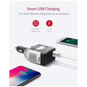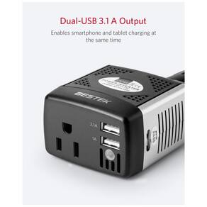 Vantagem BESTEK a marca de inversor de energia n 1 dos EUA. Fornece energia contínua de 150 watts DC para CA e 360 watts de potência de pico inversor DC para CA transforme a tensão de 12V DC para 110V DC, a tomada CA e as portas de carregamento USB 3.1A duplas, ideais para alimentar laptops, tablets, smartphones, energia banco e outros dispositivos eletrônicos Conveniente e fácil de usar conecte diretamente qualquer tomada de isqueiro de 12V e fácil de ajustar com a cabeça giratória Multi Proteção ventilador de resfriamento integrado e desligamento automático evitam o superaquecimento, a sobrecarga dos dispositivos e do carro, carga baixa, curto circuito, baixa tensão e sobretensão O que você obtém Inversor BESTEK 150W, guia de boas vindas Marca: Não Informado