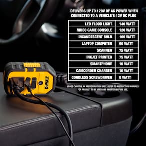 Inversor de potência contínua de 140 watts - Converte a energia CC do veículo em CA doméstica para energia em movimento - Tomada CA de 120 V - Duas saídas USB 3.1A - Operação silenciosa — sem ventilador alto e irritante - Botão de energia retroiluminado com indicador de energia e falha