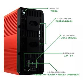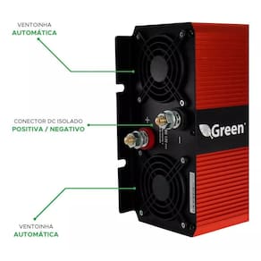 - potência de saída nominal : 2000w - potência de saída pico : 4000w - tensão de entrada dc : 12v - variação da tensão de entrada dc : 10.515v - tensão de saída ac : 220v - variação da tensão de saída ac : 220240v - frequência de saída: 60hz 3hz - corrente sem carga: 0.85a - saída usb: 5v 2.1a - fusível dc: 40a - peso do produto: 4900g - dimensões da embalagem: 22.8 x 15.4 x 5.8 cm - proteções: alarme de baixa voltagem, desligamento automático por baixa tensão, sobretensão e sobrecarga, proteção contra curto-circuito e polaridade reversa - material do gabinete: alumínio - ventoinha automática para resfriamento - indicadores led
