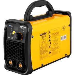 1 Inversor. Acompanha: 1 conjunto porta-eletrodo e cabo com engate rápido de 9 mm, 1 conjunto garra obra e cabo com engate rápido de 9 mm, 1 alça tiracolo e 1 máscara de escurecimento automático MSN 011 VONDER.