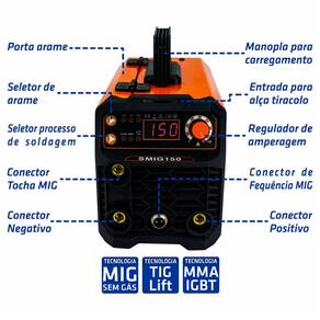 - O SMIG150 possui três processos de soldagem: por eletrodo revestido (MMA), TIG Lift e MIG sem gás (tocha MIG inclusa). Ele solda uma grande gama de materiais, como aço baixo carbono, aço inoxidável, aço especial, ligas de aço e ferro fundido, entre outros, mantendo um arco estável para uma solda uniforme,segura e de ótima qualidade