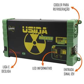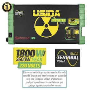 Inversor De Tensão Senoidal Usina Inverter 1800W 24V Dc - 220V Ac - 3600W Peak Descrição: Foi desenvolvida para suprir a necessidade do mercado de um inversor de qualidade com saída senoidal pura, que fosse desenvolvido e fabricado no brasil. O inversor usina utiliza o que há de melhor em tecnologia, seu microcontrolador monitora todo o funcionamento garantindo uma tensão de saída estável e limpa, mesmo com grandes variações na carga conectada em sua saída e variações na tensão de alimentação.