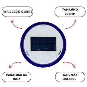 Para deixar sua piscina sempre limpa e protegida o Ionizador Solar é um aparelho simples e eficaz quando o assunto é manter sua piscina sempre pronta para o uso. O funcionamento dele é bem simples o aparelho é composto por refil que exerce a função de um catodo oxidando e gerando gases. Conta também com COBRE 100% que é um dos responsáveis principais pela eletrolise produzindo instantaneamente os ions da agua, mantendo assim sua qualidade sem qualquer necessidade de produtos químicos. Para completar tudo isso funciona a base de energia solar limpa que é captada por um painel fotovoltaico que gera energia necessária para que tudo funcione perfeitamente no seu aparelho. Tudo isso sem instalação é só colocar direto na piscina além disso um dos grandes diferenciais.