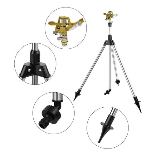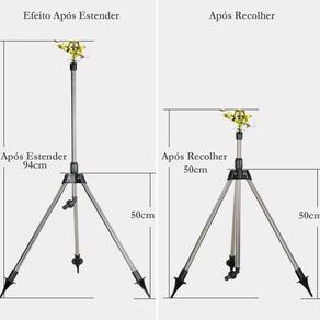 Irrigador telescópico com tripé, que permite a livre movimentação e regulagem de altura.