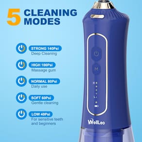 Especificações: 1. Valor direto da fábrica. A WELLLEO oferece irrigadores dentais de água de alta qualidade a preços imbatíveis, direto da fábrica para você. 2. Inovação focada no cliente Ouvimos seus comentários para melhorar constantemente nossos produtos, proporcionando uma experiência melhor sempre. 3. Design inteligente, fácil manutenção Os irrigadores dentais WELLLEO apresentam uma bola gravitacional patenteada para limpeza em ângulo total, uma aderência ergonômica para conforto, tablets de limpeza e uma escova para fácil manutenção e uma poderosa pressão de água de 40 a 140 psi para resultados eficazes. - Forte fluxo de água pulsante, limpeza profunda - recomendado por dentistas: o irrigador bucal de água fornece 1300 pulsos por minuto para remover efetivamente detritos persistentes e partículas de alimentos dos dentes e gengivas. Com cinco modos de limpeza ajustáveis, o fio dental atende às necessidades individuais. Seja para usuários iniciantes, gengivas sensíveis ou para aqueles com aparelhos, passando por ortodontia ou precisando de limpeza periodontal profunda, este é o dispositivo ideal para chuveiro oral endossado por dentistas - Bateria de longa duração - 30 dias de uso: este irrigador dental possui uma bateria recarregável de 2500 mAh que dura até 30 dias com uma única carga, eliminando a necessidade de recarga frequente. Com uma porta de carregamento USB-C e indicador de bateria (adaptador não incluído), o fio dental hidro permite o carregamento fácil usando um carregador de telefone, carregador portátil ou computador. Seu design compacto e potência de longa duração o tornam ideal para viagens e viagens de negócios - Reservatório grande de 300 ml - sem necessidade de recargas frequentes: este irrigador bucal de jato de água possui um reservatório de grande capacidade de 300 ml, fornecendo água suficiente para uma limpeza completa sem a necessidade de recargas frequentes. O reservatório é fácil de retirar para uma limpeza abrangente. Seu design compacto o torna portátil, garantindo que você possa desfrutar de dentes frescos e saudáveis em casa ou em movimento - À prova d'água IPX7 – Seguro para uso no banheiro: o design IPX7 à prova d'água mantém a umidade fora, para que você possa usar facilmente o irrigador bucal dental no banheiro sem se preocupar com respingos danificá-lo. É seguro de usar durante o banho, oferecendo cuidados bucais convenientes. Observação: Sempre feche a tampa à prova d'água na porta de carregamento durante o uso para evitar a entrada de água, garantindo que o fio dental dure mais tempo - Modo de memória inteligente com proteção contra superaquecimento (temporizador de 2 minutos): Este irrigador bucal elétrico se lembra automaticamente da última intensidade do fluxo de água usada e do modo de limpeza, eliminando a necessidade de reajustes e tornando a higiene bucal mais eficiente. O temporizador de 2 minutos garante que você conclua sua limpeza dentro do tempo recomendado para melhores resultados. Se a temperatura exceder os níveis seguros, o sistema de proteção contra superaquecimento cortará a energia para segurança. O irrigador dental pode ser utilizado novamente quando esfriar - Para ocasiões especiais, fácil de usar: este irrigador oral vem com uma garantia de 12 meses e suporte por e-mail 24 horas por dia, 7 dias por semana para garantir a satisfação do usuário. É uma excelente escolha para amigos, familiares e entes queridos, perfeita para ocasiões especiais como aniversários, Natal, Dia de Ação de Graças, Dia dos Namorados, Dia dos Pais ou Dia das Mães. O que você receberá: 1 x irrigador bucal de água, 5 x bocais (substituição recomendada a cada 3 meses), 1 x cabo USB-C e 1 x manual do usuário (sem garantia de versão em português)