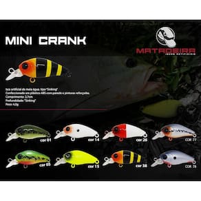 A isca artificial Mini Crank Matadeira é uma isca de meia água do tipo Sinking, muito utilizada na pescaria light ou ultra light. Possui leve chocalho interno que a torna mais atraente aos predadores. Produzida com garatéias reforçadas 3x, perfeita e ideal para pesca de peixes como tilápia, pacu, blackbass, traíra, saicanga, matrinxã, tucunaré entre outros.