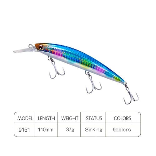 Metais do produto: Modelo de isca: isca de peixe\ nTipo de isca de pesca dura\ nPeso da isca: 40g\ nCompleto COM ANZUELOS\ NComprimento da isca: 130 mm\ nFluidez: pias\ nGancho: ganchos de aço triplo rico em carbono\ nSim: 3D Olhos de peixe\ nMaterial: ABS Cores: 9 cores\ nCaracterísticas do produto: 1. O corpo da isca adota materiais avançados de proteção ambiental, não só tem alta resistência ao impacto, mas também não produz substâncias nocivas ao meio ambiente.2. A isca foi projetada para ter o melhor equilíbrio, para que possa nadar na velocidade de recuperação mais lenta possível. As iscas têm pintura realista e olhos 3D vívidos, elas fazem com que a isca pareça um peixe real nadando na água durante a pesca.4. Corpo colorido: design de simulação, mais atraente para peixes. 5. Ganchos: anticorrosivos, maior potência, durável, água do mar universal de água doce. 6. Simulação de pele de peixe (laser): O design de simulação de pele de peixe a torna mais atraente para peixes grandes.