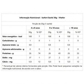Isofort Sachê (30g) - Sabor: Baunilha Isofort Sachê (30g) Proteína premium Maior aporte proteico na alimentação para auxílio na formação muscular1 ISOFORT traz em sua fórmula a proteína isolada, diminuindo da formulação concentrações de carboidratos e permitindo mais rápida absorção da proteína pelo corpo humano. O ingrediente proteína do soro de leite (Whey Protein) é fonte de proteína, nutriente esse que auxilia na formação dos músculos e ossos. Desenvolvido por um sistema inteligente de distribuição de proteína isolada e parcialmente hidrolisada do soro de leite (WPI) de excepcional qualidade e de elevada concentração (92%), o qual emprega uma tecnologia exclusiva de extração de proteína, proporcionando assim, o melhor da proteína Isolada com excelente digestibilidade e máxima absorção de nutrientes. Isofort possui em sua formulação a proteína isolado do soro do leite. Cada dose recomendada (30g), possui 26 gramas de proteína, sendo 6g de glutamina e 5g de BCAA. Benefícios: - Whey Protein Isolate Premium;- Proteína de rápida absorção e alto valor biológico;- 5g de L-Glutamina em 30g;- 6g de BCAA em 30g;- Indicado para crianças (a partir de 4 anos) e adultos;- Extraído por elevado grau tecnológico por ultrafiltração, microfiltração e nanofiltração;- Alta concentração proteica - 92% de proteína nos sabores: Neutro, Baunilha, Chocolate e Frutas Vermelhas;- Zero açúcar;- Selo de Qualidade VLabor.