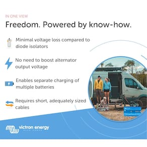- Alcance automático de 12/24 volts: o isolador de bateria Victron Energy Argofet se ajustará automaticamente a um sistema de 12 volts ou 24 volts