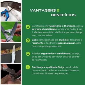 Swiss istor sharpener duplex O afiador swiss istor sharpener duplex 190 mm é uma ferramenta versátil 2 em 1. É possível corrigir e recuperar as lâminas danificadas e as ferramentas mais robustas usando a haste diamantada e seguramente ter uma ágil afiação com a ponteira em tungstênio, tudo isso na mesma ferramenta. O afiador suíço duplex possui corpo de 140 mm, confeccionado em alumínio poroso e temperado, é leve, ergonômico, personalizável e para lhe dar mais segurança, vem com 2 protetores de dedos. Sua haste de 60 mm é constituída de aço niquelado revestido com grãos diamantados de alta qualidade, com isso, a haste diamantada corrige, recupera e prepara as lâminas para a etapa da afiação. A ponteira de 30 mm é formada de metal na base de tungstênio, extremamente duro e de alta densidade, isto é, um material que resiste ao desgaste, à ou à compressão, duro como diamante, afia qualquer tipo de lâmina em segundos, com ele é possível afiar até as facas de cerâmica. O istor swiss sharpener duplex é um companheiro para a vida toda Benefícios Excepcional resistência ao desgaste. Afia qualquer tipo de lâmina. Não forma rebarba na lâmina a ponta de corte e a nitidez são mantidas por mais tempo proteção para os dedos tanto para destros como para canhotos Vantagens Produto durável, para a vida toda. Possível utilizar em qualquer ferramenta que precisa ser afiada. Não é necessária força para afiar conserva afiada por mais tempo fácil e seguro de usar qualquer pessoa pode utilizar Instruções de uso Com a haste diamantada deslize na lâmina em um movimento circular em um ângulo de 20 a 30 respeitando o ângulo existente. Após a correção, utilize a ponteira deslizando-a suavemente ao longo da borda da lâmina em um ângulo de 30 a 50. Vide vídeo abaixo sobre afiação. Manutenção/limpeza Para limpeza do afiador utilize água e detergente neutro. Características técnicas: Peso líquido: 93 g Peso bruto: 136 g Comprimento: 190 mm Comprimento da haste: 60 mm Comprimento da ponteira: 30 mm Cinco anos de Origem: suíça Mantenha fora do alcance de crianças. Histórico istor A istor foi fundada em 1964 na cidade de frauenfeld, suíça. Iniciou suas atividades com a importação de lembranças publicitárias, contudo, a principal inovação da empresa ocorreu em 1992 quando a istor inventou, desenvolveu e começou a fabricar a sua própria linha de afiadores. Por ser líder de mercado, tornou a companhia reconhecida internacionalmente. Os afiadores suíços da istor sharpener podem ser para diferentes finalidades onde se faz necessário o uso de ferramentas afiadas. Por sua eficiência, beleza e durabilidade, além do , os afiadores istor swiss sharpener conquistaram um importante espaço no mercado de lembranças publicitárias de alto padrão. Com isso, grandes marcas têm associado sua marca, principalmente ao modelo standard 100 mm, que graças ao corpo feito em alumínio poroso e temperado, é um material perfeito para realizar impressão, ou seja, um produto que pode ser personalizável, além de ser extremamente leve. A preocupação da empresa suíça istor sharpener vai muito além de entregar um produto de altíssima qualidade, promovendo ações ambientais e sociais. Sua embalagem tradicional vermelha e branca é proveniente de papelão reciclado. Já no processo de montagem do produto, a istor swiss sharpener, integra pessoas que estão sendo assistidas em tratamentos psicológicos e de etilismo, isto é, ao adquirir o afiador suíço istor sharpener você também está colaborando com esse pequeno, mas importante apoio social.