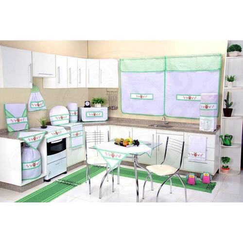 Itens de cozinha fabricado com tecido tergal na cor branco, com barrado bordado em ponto cruz com uma linda corujinha colorida, flores, borboletas e detalhes em laise na cor xadrez verde.