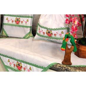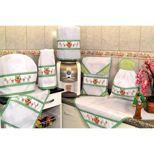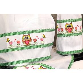 Jogo de cozinha fabricado com tecido tergal na cor branco, com barrado bordado em ponto cruz com uma linda corujinha colorida, flores, borboletas e detalhes em laise na cor xadrez verde.