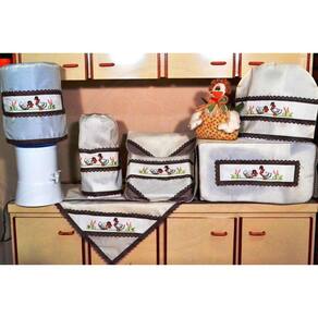 Jogo de cozinha fabricado com tecido tergal, na cor de fundo palha, com decoração central de dois lindos patinhos em ponto cruz, nas cores branca, vermelha, verde e marrom, com acabamentos em leslie marrom com bolinhas brancas.