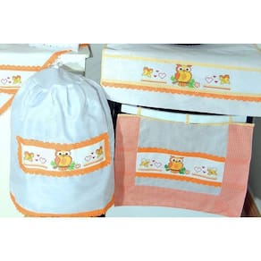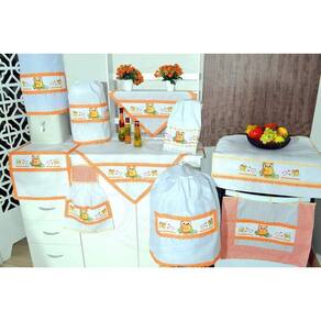 Itens de cozinha fabricados com tecido tergal na cor branca, com bordado em ponto cruz de simpáticas corujinhas e borboletas nas cores amarela, laranja e verde, barrado em poás e viés em toda a lateral na cor laranja.