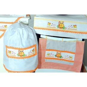 Itens de cozinha fabricados com tecido tergal na cor branca, com bordado em ponto cruz de simpáticas corujinhas e borboletas nas cores amarela, laranja e verde, barrado em poás e viés em toda a lateral na cor laranja.