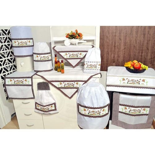 Itens para cozinha fabricados em tecido tergal branco, com barrado bordado em ponto cruz com uma mimosa vaquinha com borboletas nas cores marrom, verde e bege, com acabamentos em laise com poás e viés xadrez marrom.