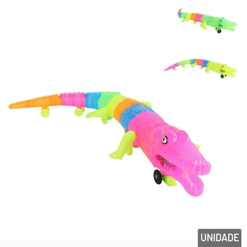 Jacaré Bate e Volta com Movimento LUZ SOM Co Entre na diversão com o nosso Jacaré Bate e Volta! Este brinquedo interativo encanta as crianças com seus movimentos animados, luzes brilhantes e sons divertidos, criando uma experiência de brincadeira envolvente e cheia de alegria. Ao ser acionado, o jacaré se move de maneira dinâmica, rastejando, enquanto suas luzes coloridas piscam, chamando a atenção dos pequenos. Os sons alegres adicionam um toque extra de diversão, estimulando a curiosidade e a imaginação. Perfeito para brincadeiras em grupo ou momentos de diversão individual, o Jacaré Bate e Volta ajuda a desenvolver a coordenação motora e proporciona horas de entretenimento. Traga um pedaço da selva para sua casa e prepare-se para aventuras emocionantes com este incrível jacaré! Acompanha uma corda de nylon para prender e mover o carrinho puxando. Disponível em cores diversas.\nEspecificações:\nMarca : MONISH\nTipo de material : Plástico, Componentes Eletrônicos\nCores ou Estampa : Color\nDimensões do Produto : 6,5 X 46 X 11,5 CM\nDimensões da Embalagem : 6,5 X 46 X 11,5 CM\nPeso Bruto (Gramas) : 0.112 Marca: Não Informado
