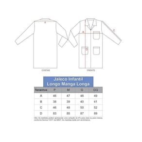 Jaleco infantil manga longa é confeccionado em tecido 100% Poliéster.