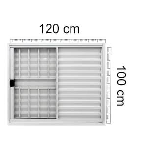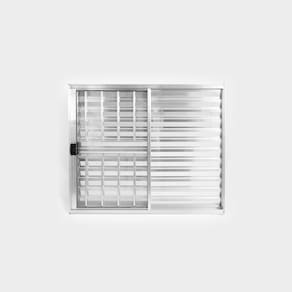 Janela Veneziana 3 folhas com grade acabamento alumínio brilhante ou pintura branca, perfil linha modular, são três folhas, sendo uma palhetada fixa, uma palhetada móvel, um vidro móvel, atende norma ABNT 10.821.