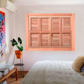 Janela da linha popular com venezianas e dois caixilhos estilo guilhotina, um caixilho fixo outro móvel, as venezianas possuem dobradiças com acabamento zincado, uma cremona e vareta em acabamento bi cromatizado, os caixilhos possuem 2 fechos borboleta. A madeira usada nos caixilhos e no batente é de 2 cm de grossura e as venezianas de 3 cm. Acompanha guarnição (vistas) de 6 cm PARA UM LADO. O tom da madeira pode variar, por se tratar de um produto marroml. A matéria prima (madeira) passa por um processo de secagem de 18 meses, incluindo secagem em estufa, os produtos saem da fábrica com lixamento pronto para pintura ou aplicação de selador e verniz.