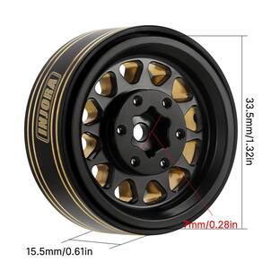 Especificações da roda: Número da peça: W1301 Material: latão Diâmetro externo: 33,5 mm (1,32 pol.) Largura: 15,5 mm (0,61 pol.) Cubo da roda: 7 mm (0,28 pol.) Cada peso: 68 g/unidades (2,40 oz) Lista de pacotes: 4 rodas INJORA de 1,3 polegadas - Fabricado em latão de alta qualidade, cada roda pesando 68 g , aumentando a estabilidade de 1/24 e 1/3 Rastreador RC 18 . - Tração aprimorada: o peso adicional no ponto mais baixo melhora a tração, especialmente em terrenos desafiadores, garantindo que seu veículo mantenha o controle. - Postura agressiva: rodas maiores de 1,3 polegadas não apenas aumentam o desempenho, mas também dão ao seu rastreador RC uma presença ousada e dominante em qualquer pista ou trilha. - Desempenho e estilo: essas rodas não apenas se destacam em desempenho, mas também possuem um acabamento em latão elegante para uma aparência de destaque. - Engenharia de precisão: usinado em CNC com perfeição com dimensões como 33,5 mm de diâmetro externo e 15,5 mm de largura, garantindo um ajuste perfeito para o carro RC SCX24 TRX4M.