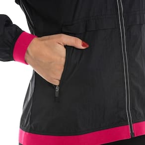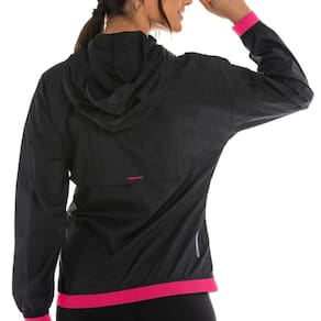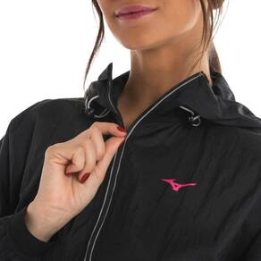 Jaqueta feita em crepe de poliamida, com as barras das mangas e do corpo com elástico, possui capuz com ajuste e recorte nas costas com função de ventilação. Os bolsos frontais são com zíper. Possui design moderno com cava deslocada. Logo refletivo.