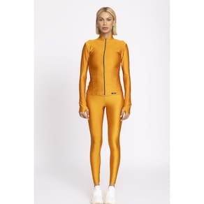 Tecido de leve compressão, brilho, elasticidade, respirabilidade, proteção UV50+ e conforto térmico, que ajudam na performance esportiva.