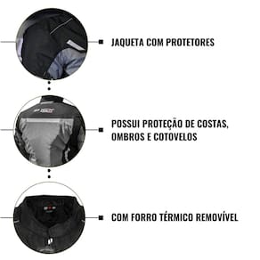 Seu sistema de ventilação e forro térmico removível garantem adaptação ao clima, enquanto os protetores de costas, ombros e cotovelos oferecem segurança total.