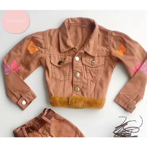Jaqueta jeans feminina infantil com pelo sintético, fechamento em botões, bolsos na frente, podendo ser com ou sem bordados, dependendo do modelo, de acordo com as fotografias.