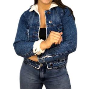 Jaquetinha Curta Jeans Feminina com com bolsos e muito elastano, toda forrada com tecido peluciado, confortável e bem quentinha.