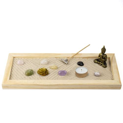 1x Vela Rechaud Difusor Flutuante 1x Incensário rosa 1x Escultura Buda 1x Areia Branca 1x Rastelo 1x Base composta de Madeira 7 pedras naturais que podem conter variações de cores conforme nosso estoque disponível. - Ótimos acabamentos e detalhes
