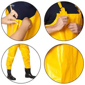 O grande diferencial desse modelo é a integração das botas ao conjunto. As botas acopladas são unidas à jardineira por meio de solda dupla, garantindo vedação eficiente e evitando qualquer tipo de infiltração, mesmo em condições extremas. Com numeração que varia do 39 ao 43, o produto atende uma ampla variedade de usuários, proporcionando conforto e segurança no calce.