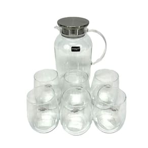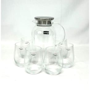Conjunto Jarra 1,8L tampa inox + 6 copos 420ml Luxo Descrição Jarra: Capacidade 1,8L Material - Vidro Tampa em Inox com 2 saídas Altura da Jarra 19cm Peso 1,05kg 1 Unidade Descrição Copos Capacidade 420ml Material Vidro Altura do copo 10,8cm Peso copo 170g 6 Unidades do vendedor: 30 dias Marca: Não Informado