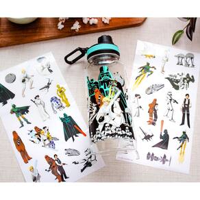 - De volta para onde tudo começou: explodindo com personalidade, este impressionante jarro de água apresenta um gráfico estilizado de heróis e vilões clássicos de Star Wars. Personalize a garrafa com as duas folhas de adesivos com base na saga épica.