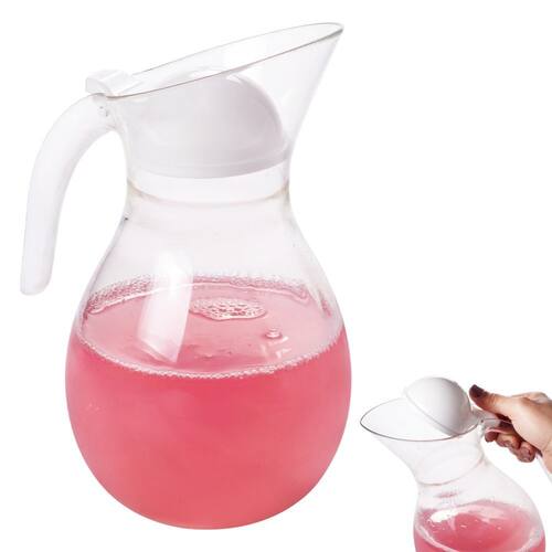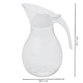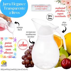 Jarra de plástico com Alça Firme totalmente Incolor, com tampa redonda branca e capacidade para 2 litros de refrescos, água, sucos, refrigerantes e demais bebidas. Sua transparência traz um aspecto requintado ao produto. O produto não amassa e tem uma espessura de 2 milímetros. Podemos garantir que sem contato manual com o produto, 99,9% das pessoas presumirão que a peça é de vidro, mas não é, embora tanto a jarra quanto a alça sejam incolores.