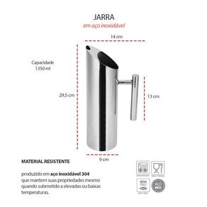 1 Jarra Capacidade: 1350 ml Medidas: 29,5 x 14 cm Material: Aço inoxidavel 304 Peso: 480g Marca: CASACHA