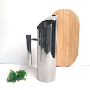 Jarra de suco e agua em aço inox. A jarra possui bico inclinado com aparador de gelo facilitando na hora de servir. O recipiente foi produzido em aço inox 304, resistente a impactos, possui maior resistencia a trincas e rupturas, mesmo em contato com altas e baixas temperaturas. Resistente a oxidaçao, nao vai descolorir ou manchar com o tempo. A jarra alem de um designer sofisticado é confortavel de segurar, sendo perfeita para servir em bares, restaurantes, festas e buffet.