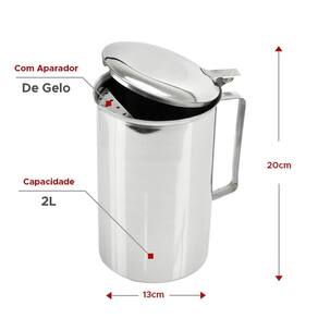 Jarra De Suco Inox 2l Tampa e Aparador De Gelo Água Refresco Essa Jarra Inox possui capacidade para 2 litros, ela é muito versátil pode ser usada tanto para uso residencial como profissional em restaurantes buffet e hotéis, para evitar respingos ela possui um aparador de gelo fico na ponta e tampa que evita que caia partículas ou mosquitos na bebida e por falar em bebidas ela pode ser usada tanto como jarra para suco, chá, cerveja ou água.