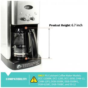 Jarra de café de vidro de substituição de 12 xícaras atualizada para modelos de cafeteira Cuisinart DCC 1200, DCC 1100BK, DCC 2650, CHW 12, CHW 12P1, DGB 550BK, DGB 550BK1, DGB 625BC, DGB 700BC e SS 12 Parte DCC 1200PRCCompatibilidade SOMENTE compatível com Cuisinart 12 Modelos de cafeteira DCC 1100BK, DCC 1200, DCC 2650, CHW 12, CHW 12P1, DGB 550BK, DGB 550BK1, DGB 625BC, DGB 700BC e SS 12. Funciona tão bem quanto o que você acabou de quebrar Vidro resistente ao calor BPA Free , feito de vidro de borosilicato resistente ao calor e à condensação, que é mais forte e durável do que outras cafeteiras de vidro. Um visual cristalino e todas as linhas são suaves e delicadas, criando uma sensação agradável na mão. Bica sem gotejamento com alça Comfort Grip O design inteligente da alça permite segurar e despejar com conforto. A jarra DuraLife possui uma alça resistente e vidro reforçado para prolongar a vida útil da jarra. Fácil de Limpar A jarra de vidro com boca larga e tampa removível é fácil de limpar, sua mão pode alcançar o fundo, é conveniente lavar a jarra por dentro. Lavar a jarra de vidro na máquina de lavar louça é , mas recomenda se lavar à mão Marca: Não Informado