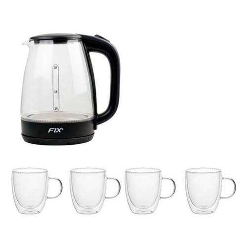 Jarra de Vidro Elétrica 1,8 L + 4 Caneca Vidro Duplo 350Ml