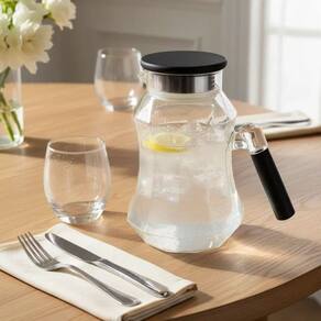 Elegancia e Estilo nesta Jarra com Tampa de Metal e Madeira e Alça de Madeira.Base. Vidro liso e Transparente como Cristal dão Originalidade e Beleza a esta Peça.