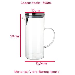 Características: Altura: 21,5cm Altura com Tampa: 23cm Diâmetro: 10cm Comprimento com alça: 15,5cm Capacidade: 1,5L Material: Vidro Borossilicato Marca: Class Home Conteúdo: 1 Jarra