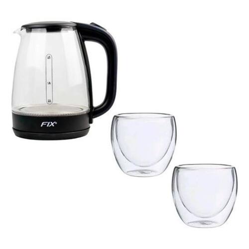 Jarra De Vidro Elétrica Chaleira Transparente Com Led 1,8L + 2 Copos De Vidro Duplo 140Ml