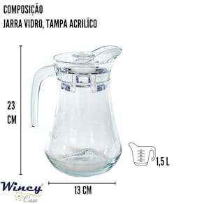 Com um design liso e transparente, esta jarra é ideal para servir uma variedade de bebidas, desde sucos refrescantes até coquetéis sofisticados. A tampa de acrílico mantém suas bebidas frescas por mais tempo, enquanto o design funcional facilita o serviço.Características Principais:Design Elegante: Vidro transparente para uma apresentação sofisticada.Capacidade Ideal: 1,5 litros, perfeita para atender a várias ocasiões.Versatilidade de Uso: Adequada para servir uma variedade de bebidas.Tampa de Acrílico: Mantém as bebidas frescas e protegidas contra impurezas.Alça Ergonômica: Facilita o manuseio e o serviço.Especificações Técnicas:Material: Vidro Transparente e Tampa de AcrílicoCapacidade: 1,5 LitrosDesign: Lisa e FuncionalMarca: WincyInstruções de Uso:Limpeza Inicial: Lave a jarra antes do primeiro uso.Preparação das Bebidas: Sirva sucos, coquetéis ou outras bebidas desejadas.Tampa de Acrílico: Utilize a tampa para manter as bebidas frescas durante o serviço.Alça Ergonômica: Facilite o transporte e o despejo das bebidas.Limpeza e Manutenção: Lave a jarra e a tampa após o uso, preferencialmente à mão.Cuidados:evite impactos bruscos para prevenir danos ao vidro.Não utilizar objetos abrasivos na limpeza para preservar a transparência do vidro.Não aquecer diretamente em fontes de calor, como fogões ou fornos. Somos loja física com mais de 50 anos de tradição.Agradecemos a visitaEstamos aguardando sua compra