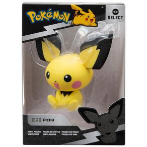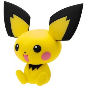 A Pokemon Pichu Select Vinyl Figure é uma figura colecionável em vinil com aproximadamente 4" de altura, representando o Pichu em estilo inspirado na série animada Pokémon, com cores e detalhes fiéis ao personagem. A peça é estática, sem articulações, indicada principalmente para exposição em prateleiras, mesas ou áreas de trabalho como item decorativo ou parte de uma coleção temática.