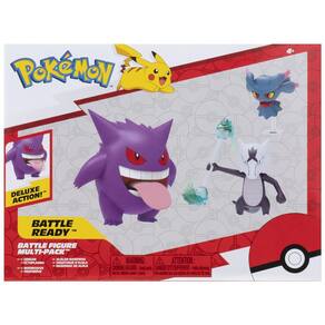 O Pokemon Battle Figure 3 Pack Ghost-type é um conjunto de três figuras colecionáveis inspirado em Pokémon do tipo Fantasma, indicado para brincadeiras de batalha e exibição em coleções. O pacote inclui uma figura pequena de Misdreavus, uma figura intermediária de Alolan Marowak com articulações para poses dinâmicas e uma figura maior de Gengar com recurso de ataque especial.