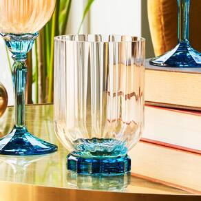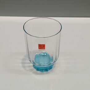 Altura: 11,2 cm Largura: 7 cm Profundidade: 8 cm Espessura: ,2 cm Peso: 0,23 Kg Diâmetro da Base: 5 cm Diâmetro do Topo: 7,5 cm Material: Vidro Cor: Transparente/Azul